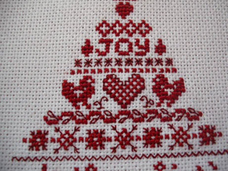 I am stitching this on very fine count sparkly evenweave (think it is about 28 count) with only one strand of Silk Mill thread and all the backstitching and contrast rows are being done in a dark red sewing cotton it is that small-scale! I am very pleased with it, will change the bottom of the design I think and put another heart in and then make it up as a hanging ornie for the tree.