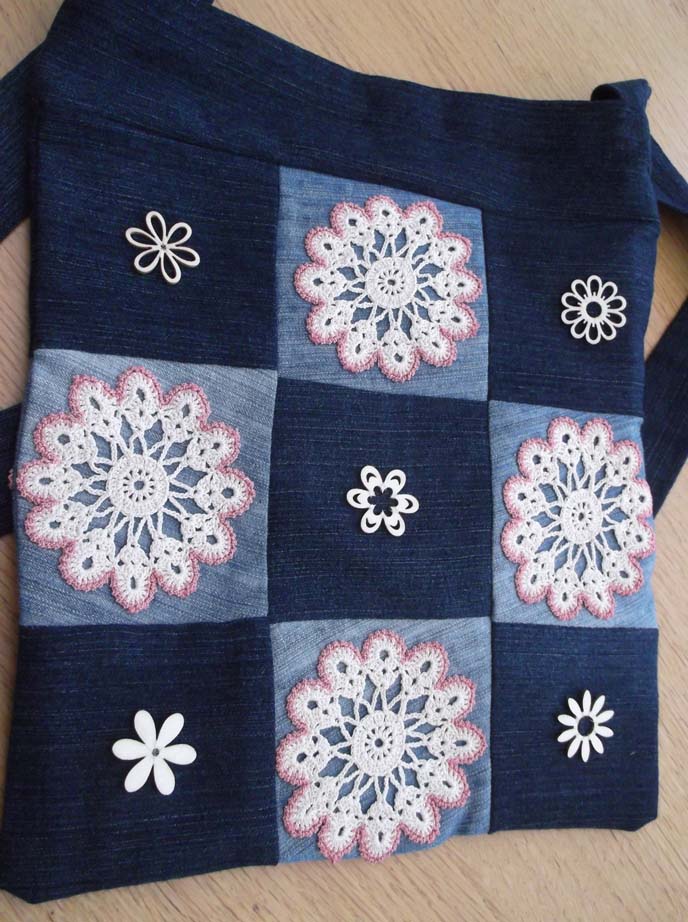 However the weekend before last I was seized with an urge to make something that has been an idea for a while – a patchwork bag made from denim garments that were no longer needed and some beautiful crochet table runners that I bought at a vintage fair a while back.