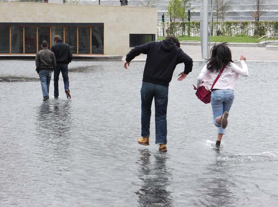 Are they walking on water? In the centre of Bradford, the pond and fountains.