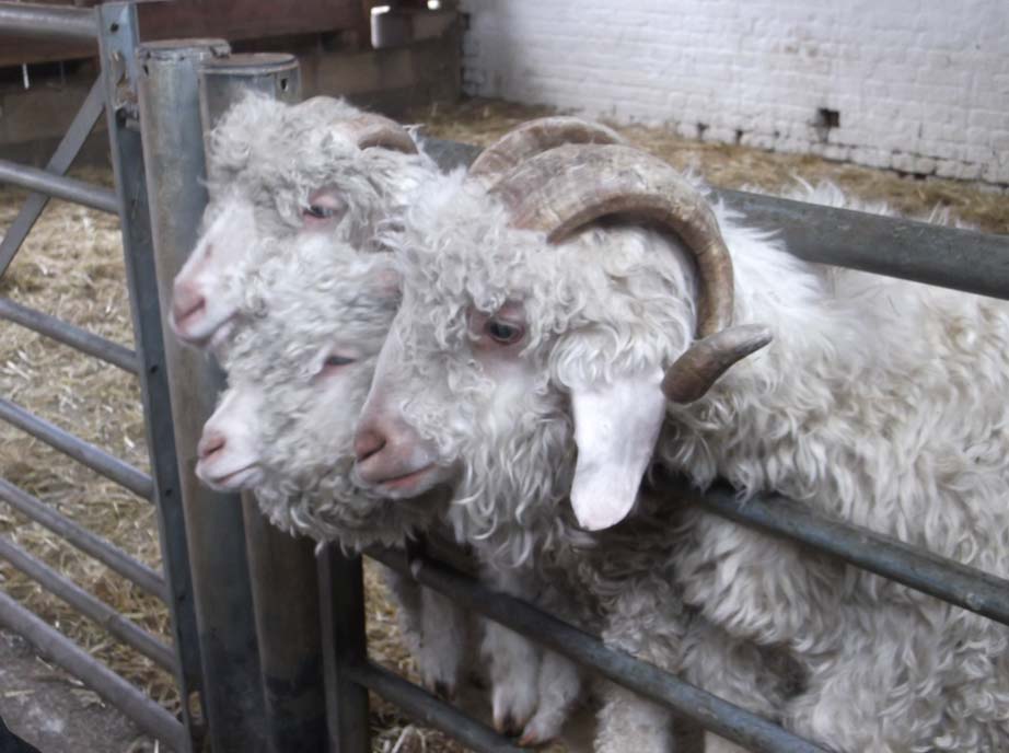 The Angora sheep we fed at Tatton Home Farm trying to get their noses into bags of food which are just out of their reach.