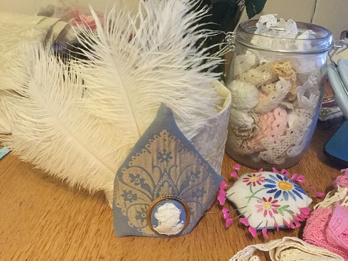 I had ordered some embellishments for the hat this week, I was so pleased with the cameo, which I found on Ebay. It goes brilliantly with the blue material.