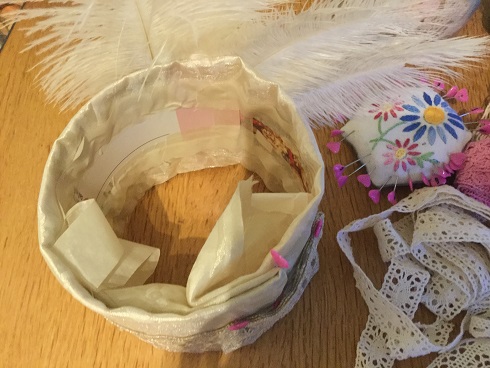 The ostrich feathers are so soft and fluffy and look brilliant. I do need to source some more trim for the top and brim edges of the hat. The real thing will be buckram covered in felt. The trim will be useful to hide the joins as buckram can be quite difficult to sew with. I found this very useful tutorial so am using that as a guide to making the top hat, but am just intending to do a flat brim.