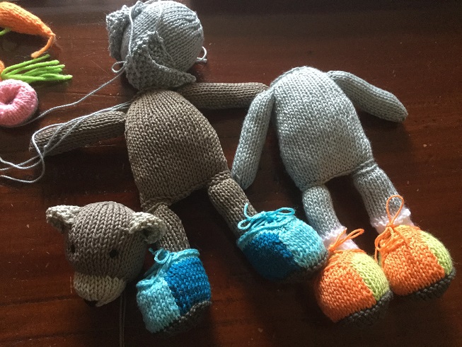 I am almost finished with the bear and bunny, I have made a bit more progress since this picture was taken, I do love the way the bear’s head has turned out and the cute little trainers. Another few hours and they should all be ready to go off to their new homes.