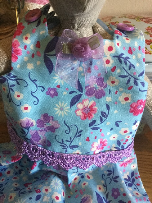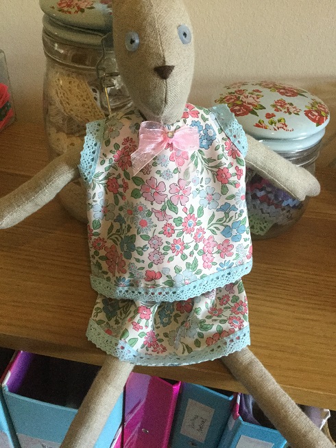 I have completed three outfits, all very cute. The first is a Liberty print and the other two are Rose and Hubble and I have loved adding all of the lace and bows and other pretty things to these. The buttons on the first outfit have poppers underneath, so no buttonholes needed!
