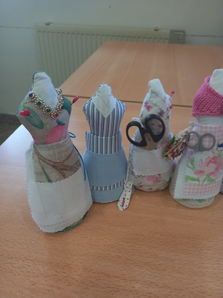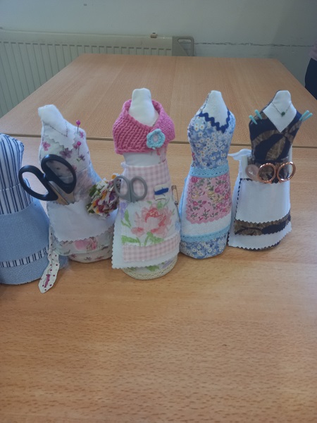 I have posted before about the mannequin pincushion and the following week after Eileen’s workshop we took them all back for a group photo. I love the variety of these, particularly the creativity with the necklace and Sue’s beautiful shawl.