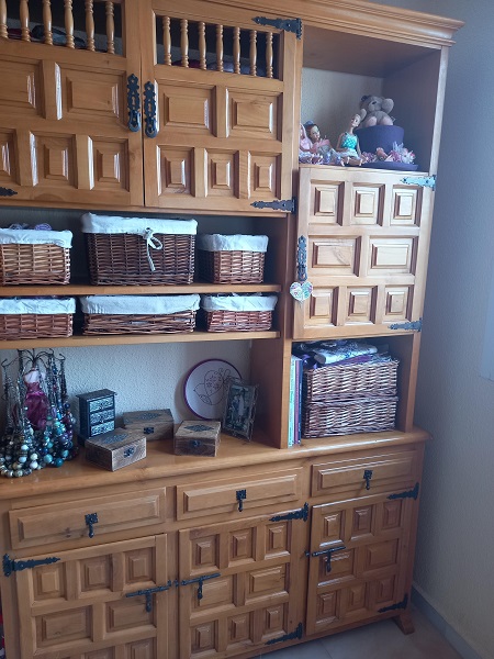 I have finally finished buying the storage to go in it, and arranging all of my stash. I am so pleases with it as not only does it look lovely, it matches the doors in the house and is very traditionally Spanish in style, it is also narrower than the wardrobe so gives me more space to sew.