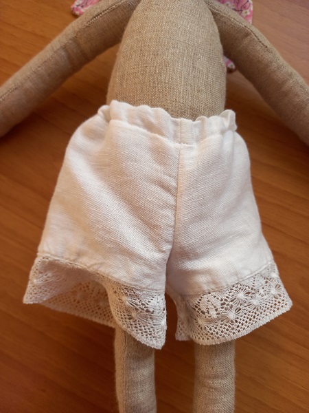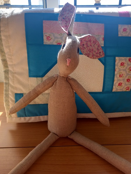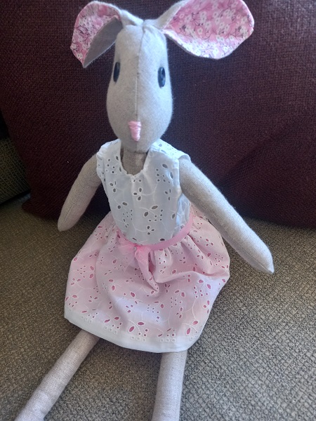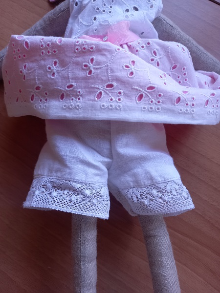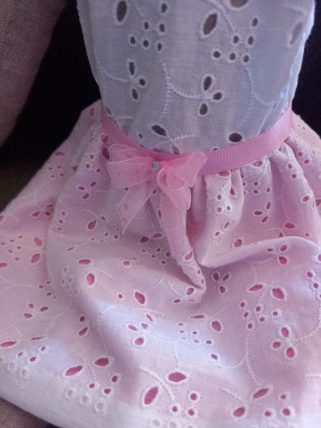 The broderie anglaise fabric was gifted to me, and I layered that with some pink cotton. All other fabric was new, from some of mine and Ellen’s many shopping trips over the years.