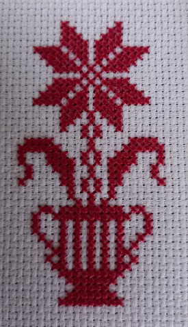 I chose to go back to a lovely set of designs for my Mum, unfortunately I can’t find them listed anywhere now. They are by a designer called Helga Mandl and they are a series of trees that when turned sideways spell out Christmas words. I stitched a Joy one in three different colours of red for my little tree, and did Merry in green variegated thread for her.