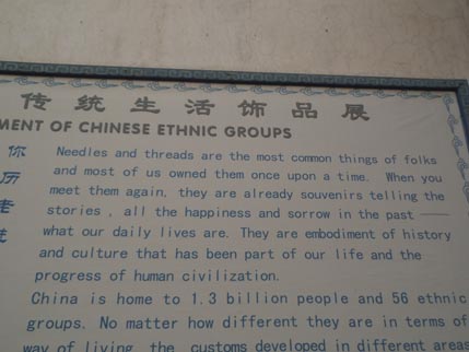 One of my favourite parts of the China Nationalities Museum that I visited while in Beijing was the exhibition of needlework, this sign outside perfectly captures how I, (and it would seem the museum organisers), feel about stitching!