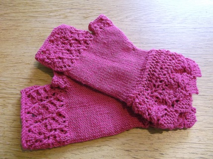 The lace pattern at the top did also go a bit awry – I like the look of the pattern that I ended up with but the two mitts don’t match very well so I have been knitting another pair which are coming out better for the Knit for Winter project and will keep the first pair for myself.