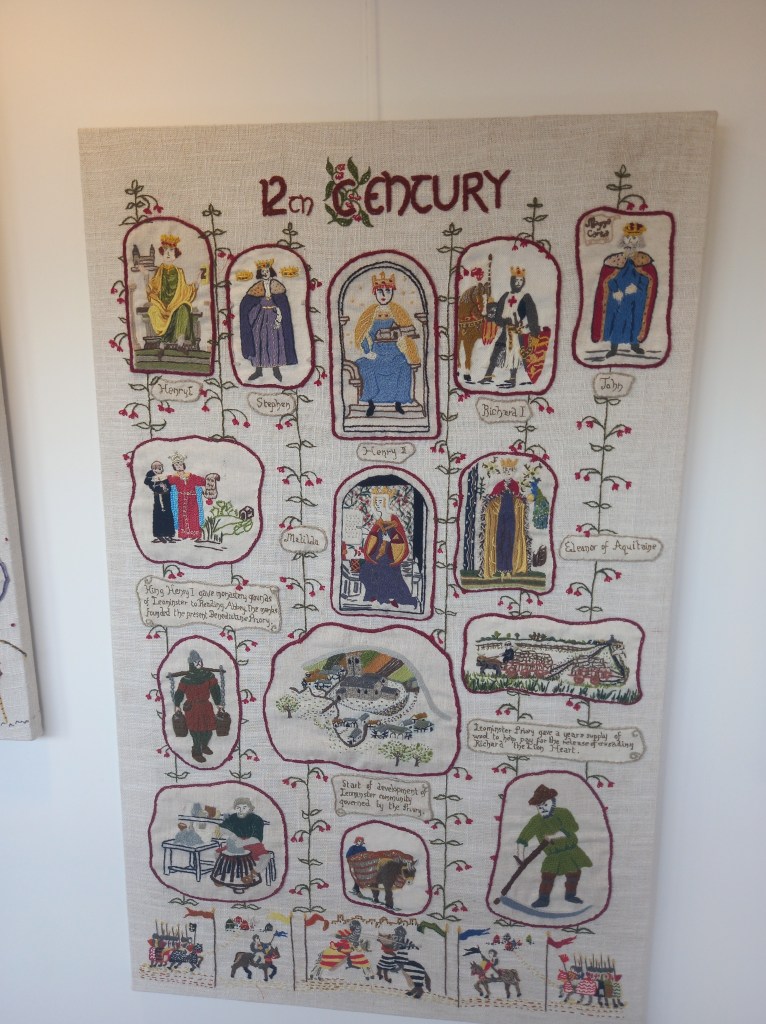 They feature a wide variety of techniques such as crewel work trapunto and applique. Some are themed, such as the history of the Priory, or WW2, others summarise the events of one century.