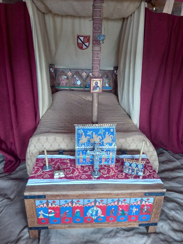 They are with their friend Lil, who is looking equally lovely. I made Ellen a green velvet over dress to go with the under dress, both of which you can see in this picture under the cloak. The head dress was embroidered and beaded over the flower motif on the fabric. Jake’s outfit was made from green brocade and the velvet hose came from a friend, I think it is the same fabric that Lil’s overdress is made from as well.