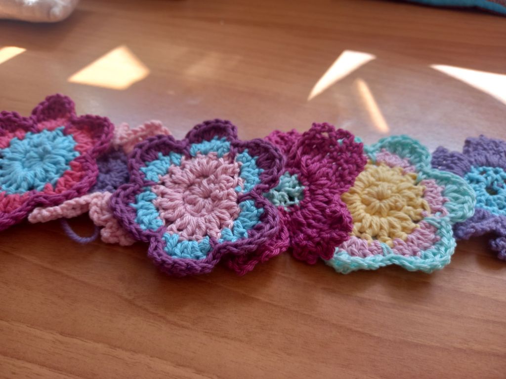Ellen also helped me to make a crochet flower garland, and it looks beautiful. She did most of the complex ones, but I am still very pleased with my efforts.