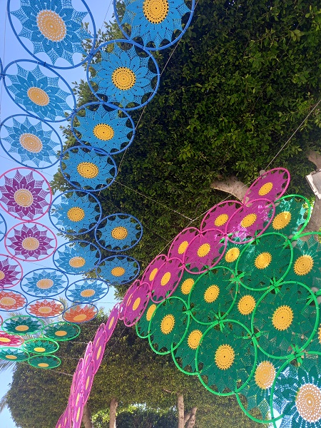 Recently there have been some great public crochet projects here, we always have lovely sunshades as the lace days we visit, and the towns have had collaborative Christmas trees as well. We went to our local town, San Fulgencio, the other week to see the beautiful crochet sunflowers they have installed by the town square. They look so gorgeous, especially next to the outlines of the palm trees.