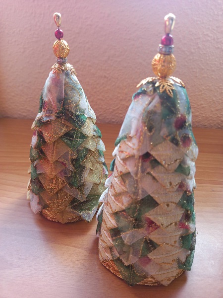 I have been inspired by various things, often it is the fabric or the beads that spark an idea. This first one was experimenting with the organza from the bags I bought. Although they are only small pieces they are perfect for little adornments like these ruffles. The red fabric is a stock of small silk pieces that have been in my stash for at least ten years.
